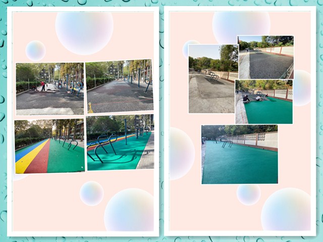 施 工完毕后,健身场地处原有的水泥地局部不平整的地方都已被修复,然后地面全部铺上了绿色的塑胶。同时,为了迎合辖区内孩子们的童心童趣,让他们更加健康快 乐的成长,社区领导特意嘱咐在新建的塑胶场地上增加了色彩绚烂的彩虹桥、红太阳等图案。工程结束后,炼油厂社区工作人员和附近的社区居民一起对此次升级改 造项目进行了验收,验收通过。