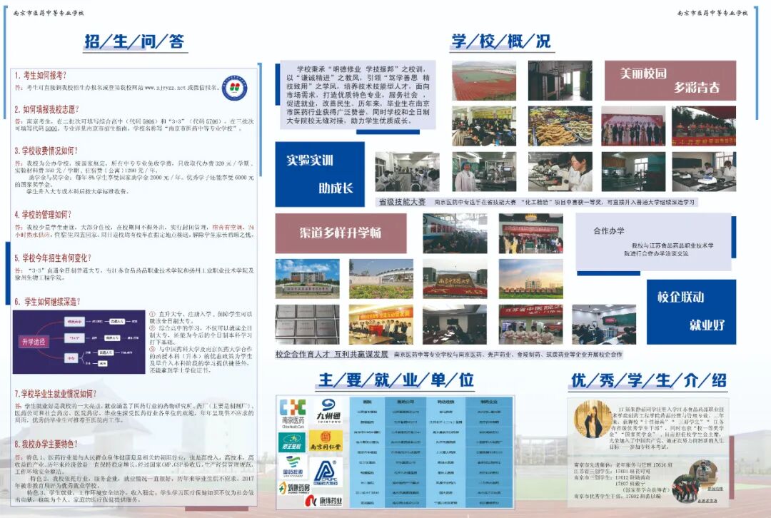 老师说:在南京市医药中专,近年来的升学率达到100%,除了通过“注册入学”进入大专之外,学校还有综合高中班,可以参加全省统一的对口单招考试;如果想一边工作一边求学的话,还可以参加中国药科大学和南京中医药大学的函授课程,一边工作一边学习,拿到本科学位。
